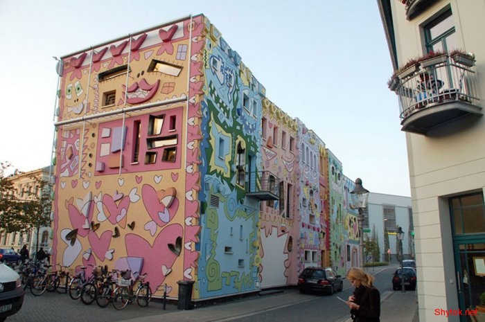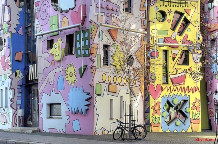 Работа Джеймса Рицци (James Rizzi) стала результатом сотрудничества с немецким архитектором Конрадом Клостером (Konrad Kloster). Брауншвейг – весьма небольшой городок с достаточно будничной архитектурой. Микрозона, где расположены дома с разукрашенными фасадами в стиле мультипликационного поп-арта, ярко контрастируют с окружающими зданиями и выглядят, как островок чего-то невероятно веселого, забавного, позитивного. Стены домов будто сошли со страниц детского комикса.